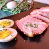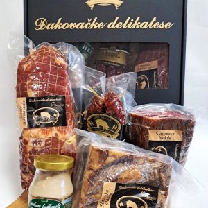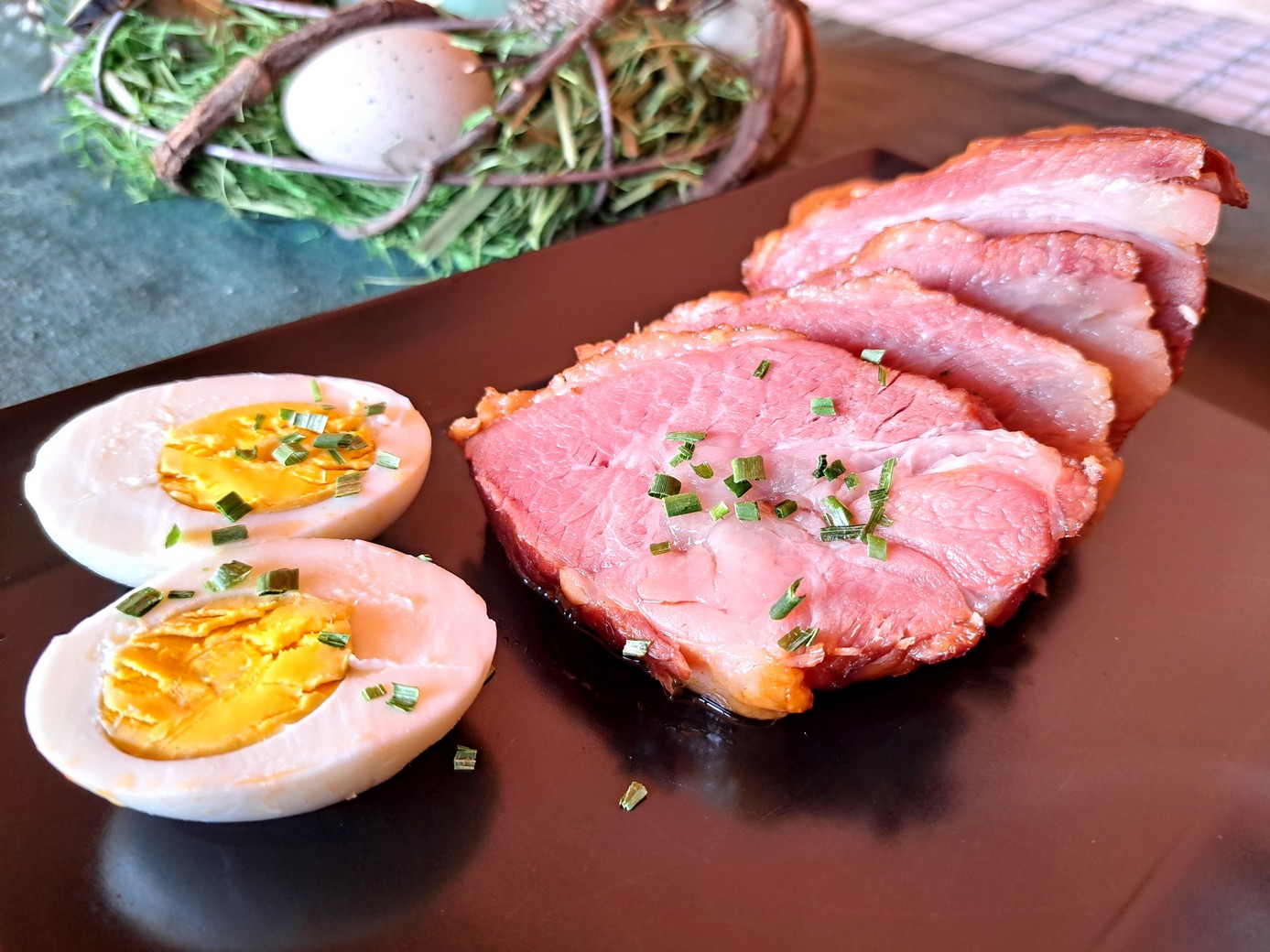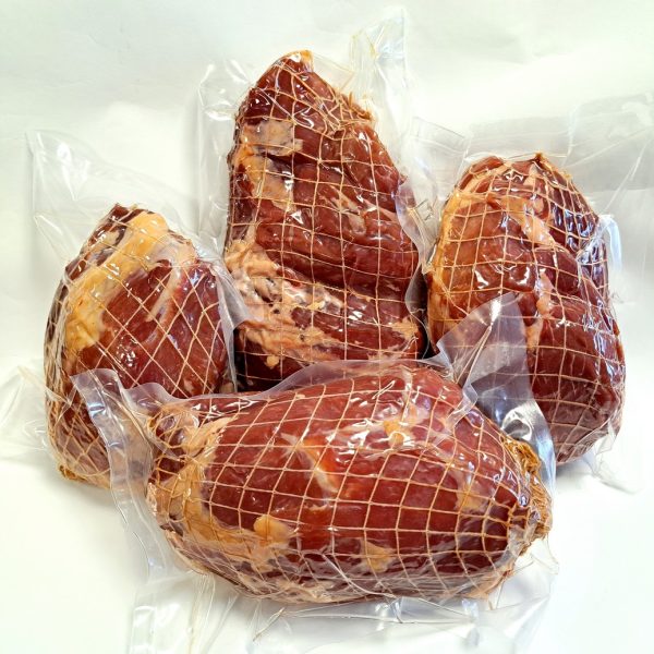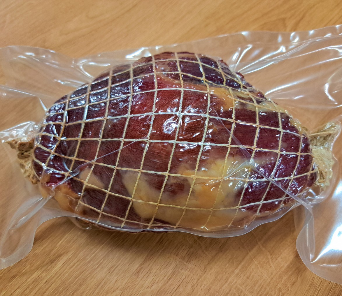 Uskrsna šunka za kuhanje od Crne slavonske svinje, iskoštena, dimljena i sušena u mrežici te vakumirana.